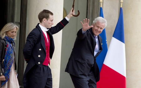 美國通用電氣集團董事長兼首席執(zhí)行官杰夫·伊梅爾特(右)28日離開巴黎愛麗舍宮時向記者揮手致意。當日,法國總統(tǒng)奧朗德與伊梅爾特圍繞法國阿爾斯通公司旗下全球電力業(yè)務(wù)可能被通用電氣或是德國西門子公司收購一事舉行了會談。