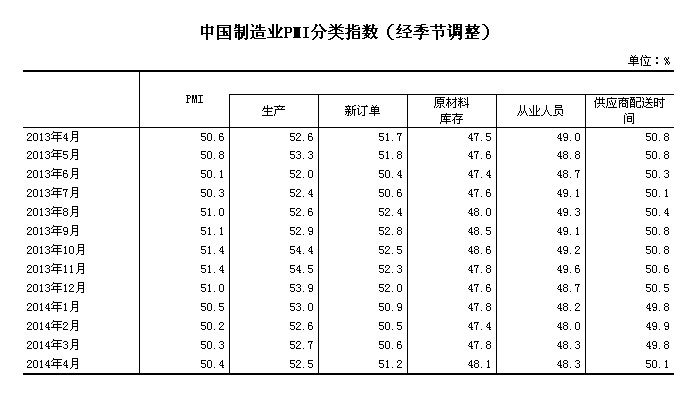 2014年4月,中國(guó)制造業(yè)采購(gòu)經(jīng)理指數(shù)(PMI)為50.4%,連續(xù)2個(gè)月微升0.1個(gè)百分點(diǎn),預(yù)示我國(guó)制造業(yè)繼續(xù)保持平穩(wěn)增長(zhǎng)勢(shì)頭。