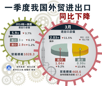 此前海關總署發(fā)布的一季度數(shù)據(jù)顯示,2014年一季度,中國進出口總額9659億美元,同比下降1%。其中,出口下降3.4%,進口增長1.6%;貿易順差下降59.8%。