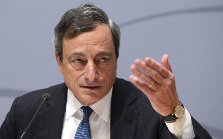 歐洲央行8日公布5月份利率決議,將關(guān)鍵再融資利率維持在0.25%的紀(jì)錄低位,符合市場預(yù)期。歐洲央行行長德拉吉表示,歐元區(qū)繼續(xù)溫和復(fù)蘇,通脹壓力有所抑制,歐洲央行將在很長一段時(shí)間內(nèi)維持低利率水平。歐洲央行對下個(gè)月在歐元區(qū)放寬貨幣政策一事持開放態(tài)度。 圖為德拉吉當(dāng)日在布魯塞爾出席貨幣政策會議結(jié)束后的新聞發(fā)布會。