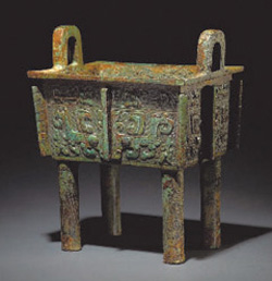 中國的青銅器主要指先秦時期用銅錫合金制作的器物,有禮器、炊器、食器、酒器、樂器等,流行于新石器時代晚期至秦漢時代。夏代晚期,青銅器的鑄造技術(shù)已經(jīng)基本熟練,銅器造型初具規(guī)范,器壁勻薄。商代前中期是中國青銅器藝術(shù)趨于成熟的發(fā)展時期,以酒器為主的禮器體制初步建立。青銅器構(gòu)圖繁密,線條峻深勁利。滿布器身的紋飾大量采用浮雕和平雕相結(jié)合的方法,精美絕倫,夸張、象征手法的獸面紋既莊嚴(yán)神秘又富有生氣。周初禮器出現(xiàn)了向重食體制轉(zhuǎn)變的端倪,鑄記長篇銘文是西周青銅禮器的重要特點(diǎn)。新的器型端莊厚重,動物紋飾或流轉(zhuǎn)舒暢,或樸質(zhì)簡率。春秋戰(zhàn)國時期,器物的生活實(shí)用性加強(qiáng),禮器的功用逐漸消失。失蠟法和印模塊范拼合法的產(chǎn)生,使鑲嵌工藝絢麗工巧。這一時期的青銅器造型新穎精美,器形多樣,紋飾繁縟富麗,多為譎奇精麗之器。被視為國之重器的青銅器自古以來就是收藏家眼中的頂級收藏品,F(xiàn)階段由于各方面的原因,中國古代青銅藝術(shù)品處在價格洼地,但是其豐富的藝術(shù)價值是毋庸置疑的。