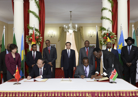 5月11日,國務院總理李克強在內羅畢和肯尼亞總統(tǒng)肯雅塔、烏干達總統(tǒng)穆塞維尼、南蘇丹總統(tǒng)基爾、盧旺達總統(tǒng)卡加梅,以及坦桑尼亞、布隆迪的總統(tǒng)代表共同見證中國肯尼亞關于蒙巴薩-內羅畢鐵路建設相關合作文件簽署。