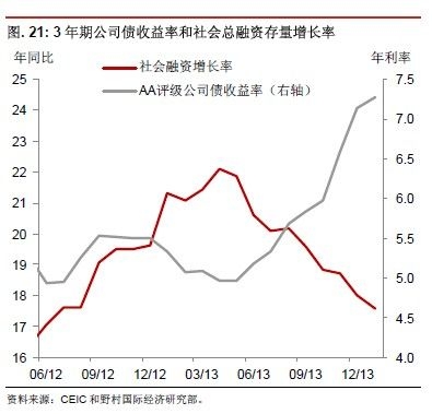 近年來,金融自由化一直是政府的目標(biāo),近期政策已經(jīng)使得利率更有彈性,并推動理財(cái)產(chǎn)品規(guī)模大幅增長。中國人民銀行行長周小川在今年3月11日全國人大的記者招待會上表示存款利率自由化可能在未來1-2年內(nèi)實(shí)現(xiàn)。周行長根據(jù)國際經(jīng)驗(yàn)還預(yù)期利率自由化后利率會上升。確實(shí),利率部分市場化已經(jīng)導(dǎo)致利率上升了(圖21).