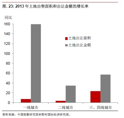 2013年土地出讓金增長了52.4%,首次突破人民幣4萬億元。我們估計(jì),從出讓面積來看,一線城市土地出讓面積增長7.0%,二線城市增長3.7%,三線和四線城市增長23.2%(圖23)。土地出讓金額則分別增長了159.3%、34.2%和57.0%。土地出讓金大幅增長,一定程度上表明了地方政府為緩解融資平臺資金壓力而提高土地出讓規(guī)模的沖動。但土地出讓面積的增加造成房屋供應(yīng)量增加,并造成供需失衡問題進(jìn)一步惡化。