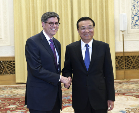 5月13日,國務(wù)院總理李克強在北京人民大會堂會見美國總統(tǒng)特別代表、財政部長雅各布·盧。 李克強表示,中方愿與美方拓展貿(mào)易投資、能源環(huán)保、氣候變化等領(lǐng)域務(wù)實合作,推進雙邊投資協(xié)定談判進程。希望美方采取切實措施放寬民用高技術(shù)物項對華出口,為中國企業(yè)赴美投資提供公平競爭環(huán)境。
