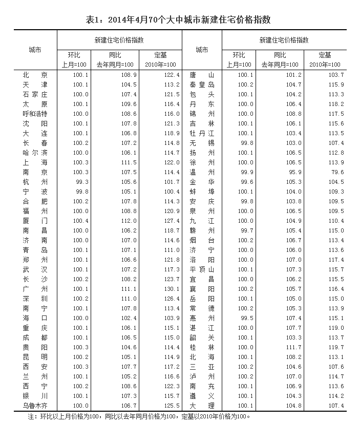 (二)與去年同月相比,70個大中城市中,價格下降的城市有1個,上漲的城市有69個。4月份,同比價格變動中,最高漲幅為13.6%,最低為下降4.4%。