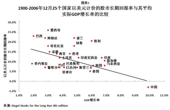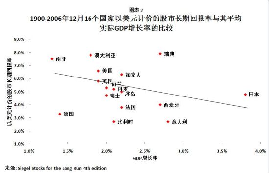 西格爾在其著作《股市長線法寶》中表示:“實(shí)際GDP增長率和股市回報(bào)率之間存在著一種反比關(guān)系。意即經(jīng)濟(jì)增長越快的個(gè)別(發(fā)達(dá))國家,其股票投資者的股市回報(bào)率越低。同樣,在發(fā)展中經(jīng)濟(jì)體中單個(gè)國家的GDP增長率和股市回報(bào)率之間也存在著一種反比關(guān)系。”