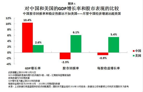 8%……然而,其股市回報(bào)率卻落后于美國每年大約8%。在過去15年,中國每股收益增長率為-0.9%,同期標(biāo)準(zhǔn)普爾500強(qiáng)企業(yè)榜單上的中國企業(yè)卻以每年5.4%的數(shù)字在增加。最近,也就是在2010年,中國的GDP增長率估計(jì)已超過美國7%,但MSCI中國指數(shù)的回報(bào)率僅為4.8%……另一方面,自2007年10月美國和中國的股市峰值以來,中國GDP增長率每年大約超過美國10%,但美國的股市回報(bào)率為15.1%,中國的股市回報(bào)率卻落后美國每年大約2.7%。”