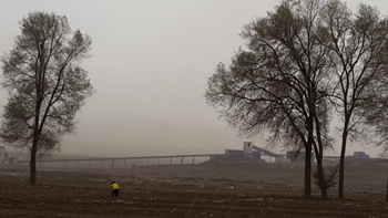 記者站在聯(lián)豐村村口,風(fēng)一起,大中礦業(yè)書記溝鐵礦生產(chǎn)線呈現(xiàn)出一條硝煙狀沙帶  張彬/攝