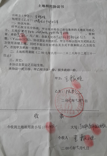 村民王根旺與大中礦業(yè)簽的土地租用協(xié)議書,洪地每畝補(bǔ)償1803元,旱地每畝補(bǔ)償1202元,嚴(yán)重低于國家標(biāo)準(zhǔn)  張彬/攝