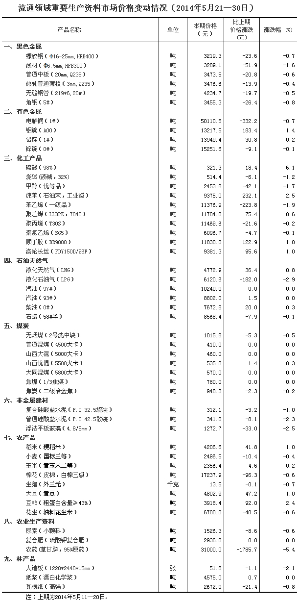 2014年5月下旬(2014年5月21-30日),據(jù)對24個。▍^(qū)、市)流通領(lǐng)域9大類50種重要生產(chǎn)資料市場價(jià)格的監(jiān)測顯示,與5月中旬相比,13種產(chǎn)品價(jià)格上漲,29種下降,8種持平。