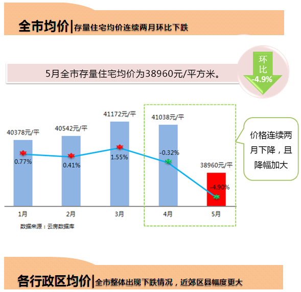 近日,北京云房數(shù)據(jù)市場研究部發(fā)布5月全市存量房住宅價格更新結(jié)果,數(shù)據(jù)顯示,5月北京市存量住宅平均價格為38960元/平方米,環(huán)比上月下跌4.9%。當(dāng)月二手房住宅市場,由于新增房源、掛牌價降幅、議價空間等多項指標(biāo)均為年內(nèi)較高水平,使得北京二手住宅市場逐步由賣方市場變?yōu)橘I方市場。另一方面,由于受到自住房及信貸政策的影響,購房者觀望情緒嚴(yán)重,入市不積極,使得剛需購房的主要區(qū)域(即近郊區(qū))的成交量受到明顯影響。