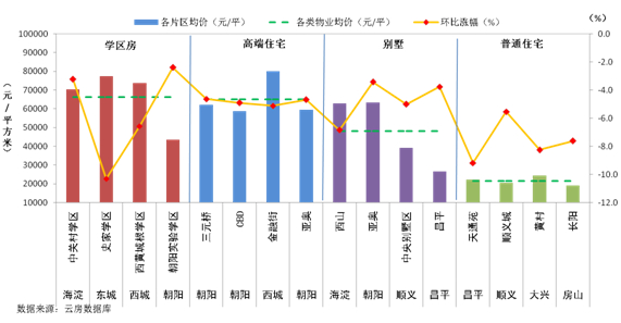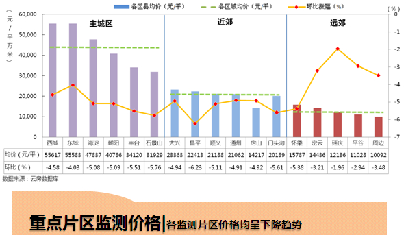 本月北京市全部16個監(jiān)測片區(qū)物業(yè)的價格均呈下降趨勢,其中上月漲幅最大的史家學(xué)區(qū)學(xué)區(qū)房本月下降幅度最大,環(huán)比下跌10.3個百分點。各類物業(yè)中,普通住宅下降幅度較大,4個監(jiān)測片區(qū)環(huán)比平均下跌7.7%。