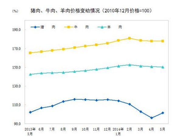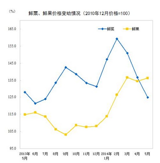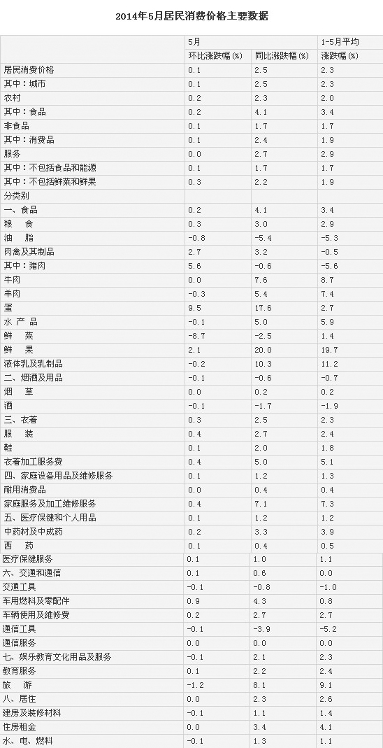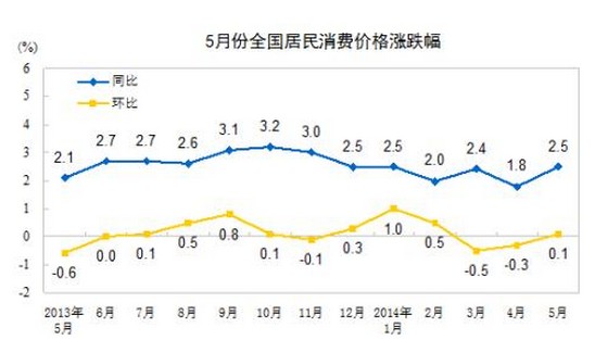 2014年5月份,全國居民消費價格總水平同比上漲2.5%。其中,城市上漲2.5%,農(nóng)村上漲2.3%;食品價格上漲4.1%,非食品價格上漲1.7%;消費品價格上漲2.4%,服務價格上漲2.7%。1-5月平均,全國居民消費價格總水平比去年同期上漲2.3%。
