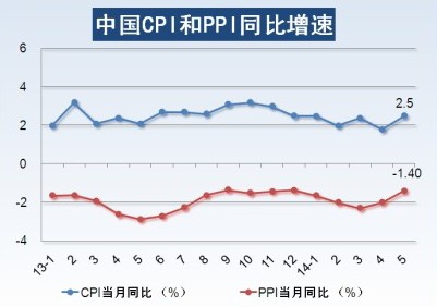 經(jīng)參6月10日綜合消息  國家統(tǒng)計(jì)局?jǐn)?shù)據(jù)今日上午公布數(shù)據(jù)顯示,5月份,全國居民消費(fèi)價(jià)格總水平(CPI)同比上漲2.5%,創(chuàng)4個(gè)月新高,前值升1.8%,預(yù)期升2.4%;全國工業(yè)生產(chǎn)者出廠價(jià)格(PPI)同比降1.4%,環(huán)比降0.1%,前值降2.0%,預(yù)期降1.6%,連降27個(gè)月。以下為部分機(jī)構(gòu)和專家觀點(diǎn)匯總。