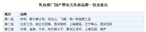 6月13日,中國(guó)乳制品工業(yè)協(xié)會(huì)在北京發(fā)布第三批嬰幼兒配方乳粉新產(chǎn)品。共有七家企業(yè)入圍第三批名單,包括光明、雀巢、大慶、哈爾濱太子、黑龍江龍丹、上;ü、美廬。加上前兩批入圍的12家企業(yè),目前共有19家企業(yè)入圍。