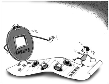 在北京,隆安律師事務(wù)所合伙人金作鵬稱,他所代理的數(shù)十起信托訴訟涉及多類“免責(zé)陷阱”:一是信息披露不到位,信托公司在網(wǎng)站發(fā)布凈值,代替實地寄送;二是利用復(fù)雜法律文書脫責(zé),設(shè)法提高投資者問責(zé)、中止已虧損信托的條件;三是用產(chǎn)品說明書等取代合同協(xié)議!耙恍┳龇ㄒ茁裣码[患,甚至只給投資者合同封底,簽字后再寄送全文!
