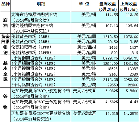 國際大宗商品期貨價(jià)格明細(xì)表[2014-6-23]