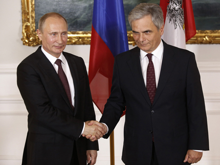 6月24日,在奧地利維也納,奧地利總理法伊曼(右)歡迎俄羅斯總統(tǒng)普京。 奧地利石油天然氣集團和俄羅斯天然氣工業(yè)股份公司24日簽署協(xié)議,建設“南溪”輸氣管道奧地利段項目。盡管歐盟委員會出于政治原因希望擱置這一項目,奧地利石油天然氣集團依然堅持開展該項目。