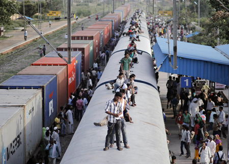 印度鐵道部長高達8日宣布鐵路系統(tǒng)改革計劃,包括鐵路系統(tǒng)對私人資本和外資開放,并將盡快建設高鐵。印度鐵路部門是印最大國有資產(chǎn)之一,由于經(jīng)營不善,連年虧本,基礎設施年久失修,遠遠不能滿足國內(nèi)乘客需求,經(jīng)常發(fā)生安全事故。 圖為,7日在印度洛尼,乘客搭乘一列超載的火車出行。