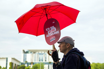 在德國柏林總理府前,一名男子持傘參加工會(huì)組織的游行活動(dòng),支持每小時(shí)8.5歐元的全國最低工資標(biāo)準(zhǔn)。新華社/路透 |