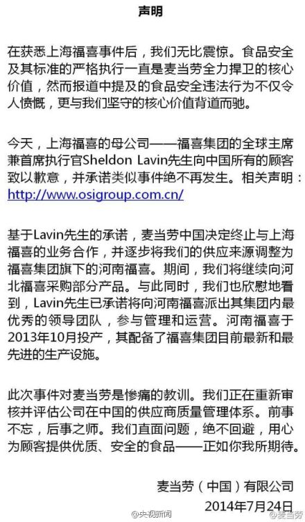 @央視新聞:#麥當(dāng)勞肯德基供應(yīng)商被曝光#【麥當(dāng)勞終止與上海福喜的合作】@麥當(dāng)勞 今晨發(fā)布聲明稱,上海福喜母公司福喜集團(tuán)全球主席兼首席執(zhí)行官向中國所有顧客致歉,并承諾類似事件絕不發(fā)生;谄涑兄Z,麥當(dāng)勞中國決定終止與上海福喜的業(yè)務(wù)合作,并將供應(yīng)來源調(diào)整為福喜旗下的河南福喜。(央視記者陳雯 王殿甲)