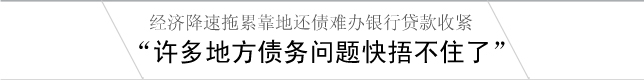 | 《經(jīng)濟參考報》記者在多省采訪發(fā)現(xiàn),部分地區(qū)在經(jīng)濟下行的壓力下收入增速不斷下降、發(fā)展方式轉(zhuǎn)變緩慢,債務(wù)問題因此凸顯。與此同時,伴隨土地及房地產(chǎn)市場的陡然降溫,過去借債發(fā)展、靠地還債的粗放發(fā)展模式難以為繼,一些地方的債務(wù)風險迅速積聚。隨著債務(wù)進入集中還款期,部分地區(qū)對土地更為依賴,逆市場形勢加速賣地步伐;銀行等金融部門因擔憂地方債風險,對政府貸款往往“明松暗緊”,致使不少地方“腹背受敵”。 | |