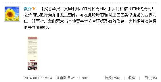 顏喬通過微博表示,“我們相信《IT時(shí)代周刊》之新聞脅迫行為并非孤立事件,亦在此呼吁有和阿里巴巴類似遭遇的業(yè)界同仁一并面對(duì)。我們?cè)敢馀c其他受害者分享證據(jù)及有效信息,為其提供法律援助并共同舉報(bào)!