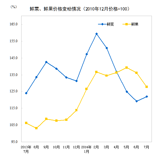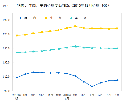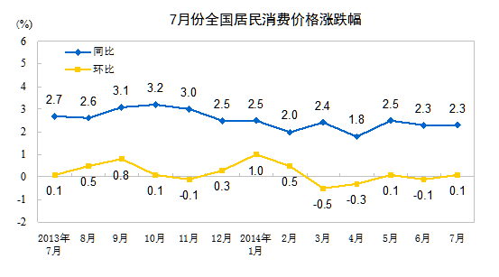 2014年7月份,全國居民消費價格總水平同比上漲2.3%。其中,城市上漲2.3%,農(nóng)村上漲2.1%;食品價格上漲3.6%,非食品價格上漲1.6%;消費品價格上漲2.2%,服務(wù)價格上漲2.5%。1-7月平均,全國居民消費價格總水平比去年同期上漲2.3%。