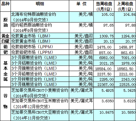 國際大宗商品期貨價格明細(xì)表[2014-8-11]