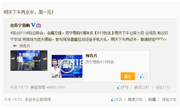 昨日蘇寧易購官微稱將于8月4日,即今日通過PPTV發(fā)布蘇寧易購818新玩法,蘇寧云商運營總部執(zhí)行副總裁李斌微博透露發(fā)布時間為今日下午兩點半。記者聯(lián)系蘇寧易購市場人士,其證實PPTV將現(xiàn)場直播“亮劍818”高端訪談節(jié)目,屆時李斌現(xiàn)場將詳細釋疑百日會戰(zhàn)和818玩法懸疑。