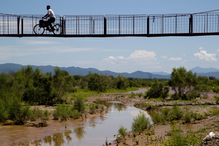 墨西哥索諾拉州烏勒斯地區(qū)一個(gè)銅礦日前泄漏了4萬(wàn)立方米的硫酸,對(duì)索諾拉河的造成嚴(yán)重污染。受此事故影響,12日,墨西哥7個(gè)市鎮(zhèn)的20000名居民的供水而受到限制。墨西哥國(guó)家人權(quán)委員會(huì)稱正在對(duì)事故進(jìn)行調(diào)查。 圖為12日一名烏勒斯地區(qū)居民騎車從索諾拉河上的吊橋經(jīng)過(guò)。