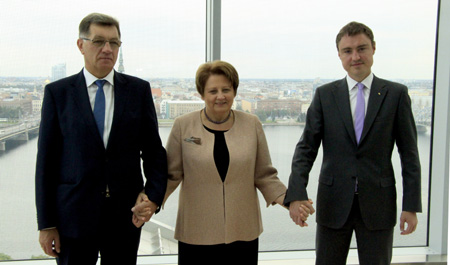 8月23日,在拉脫維亞首都里加,立陶宛總理布特克維丘斯(左)、拉脫維亞總理斯特勞尤馬(中)和愛沙尼亞總理羅伊瓦斯攜手合影。 拉脫維亞、愛沙尼亞和立陶宛三國總理23日至24日在拉脫維亞首都里加舉行會談,表示在政治上支持“波羅的海鐵路”項目建設(shè)。據(jù)拉通社報道,三國總理主要討論了“波羅的海鐵路”項目的實施問題,并承諾三國將于今年10月簽署關(guān)于建立實施“波羅的海鐵路”項目聯(lián)合企業(yè)的協(xié)議,明年年初向歐盟提出撥款申請。