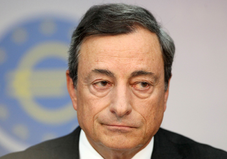 歐洲央行4日舉行例行貨幣政策會(huì)議,決定自10日起將所有利率降低10個(gè)基點(diǎn),歐元區(qū)基準(zhǔn)利率降至0.05%。根據(jù)公告,主要再融資利率調(diào)降至0.05%,隔夜存款利率降至負(fù)0.2%,隔夜貸款利率調(diào)低至0.3%。 圖為歐洲央行行長德拉吉當(dāng)天在記者會(huì)上發(fā)表聲明。