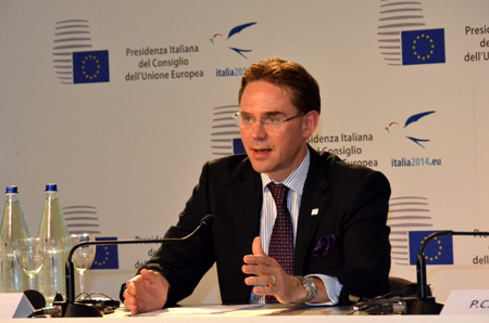 9月13日,在意大利米蘭,歐盟委員會負(fù)責(zé)經(jīng)濟(jì)與貨幣事務(wù)委員卡泰寧出席新聞發(fā)布會。 當(dāng)日,歐盟輪值主席國意大利的經(jīng)濟(jì)部長帕多安在米蘭歐盟財政部長非正式會議結(jié)束時說,促進(jìn)歐洲經(jīng)濟(jì)增長需要更多投資,尤其需要私人投資以及發(fā)揮催化劑作用的公共投資,為此需要創(chuàng)造盈利條件,特別是通過結(jié)構(gòu)性改革為投資解凍。