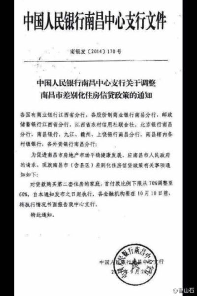 中國(guó)人民銀行南昌中心支行9月29日發(fā)布文件,進(jìn)一步支持放松房貸。二套房首付從70%降到60%,即日起實(shí)施。這是首個(gè)央行省會(huì)支行發(fā)文明確放松限貸。