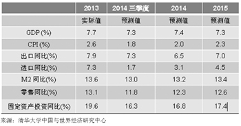 這一表態(tài)和最近幾天一些智庫機(jī)構(gòu)的預(yù)測較為接近。清華大學(xué)中國與世界經(jīng)濟(jì)研究中心公布的四季度報告稱:2014年二季度經(jīng)濟(jì)增長速度的回升并沒有延續(xù)到第三季度。7月以來,拉動GDP增長的三駕馬車中投資和消費的增長速度相對今年上半年和全年同期都有所下降,與之相對的,外需有所恢復(fù)帶來了出口的整體回升,為中國經(jīng)濟(jì)維持比較快的增長速度提供了一定支持。根據(jù)模型預(yù)測,2014年GDP全年增速7.4%。