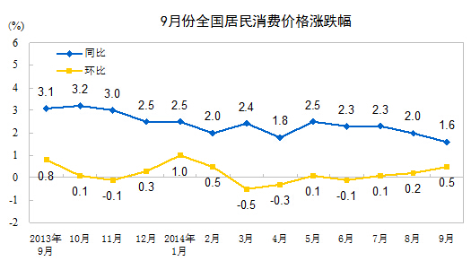 統(tǒng)計(jì)局15日發(fā)布數(shù)據(jù)顯示,2014年9月份,全國(guó)居民消費(fèi)價(jià)格總水平同比上漲1.6%。其中,城市上漲1.7%,農(nóng)村上漲1.4%;食品價(jià)格上漲2.3%,非食品價(jià)格上漲1.3%;消費(fèi)品價(jià)格上漲1.4%,服務(wù)價(jià)格上漲2.3%。1-9月平均,全國(guó)居民消費(fèi)價(jià)格總水平比去年同期上漲2.1%。