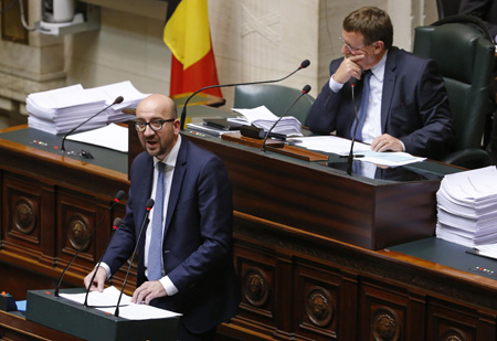 10月14日,比利時(shí)新任首相夏爾·米歇爾(左下)在首都布魯塞爾的聯(lián)邦議會(huì)發(fā)表施政演說。 他表示,促進(jìn)就業(yè)將是新政府施政方針的重中之重。為了促進(jìn)和保護(hù)就業(yè),新政府計(jì)劃撥付40億歐元,同時(shí)決定降低勞動(dòng)力成本。新政府還將制定一系列措施鼓勵(lì)年輕人和長(zhǎng)期失業(yè)者走上工作崗位。