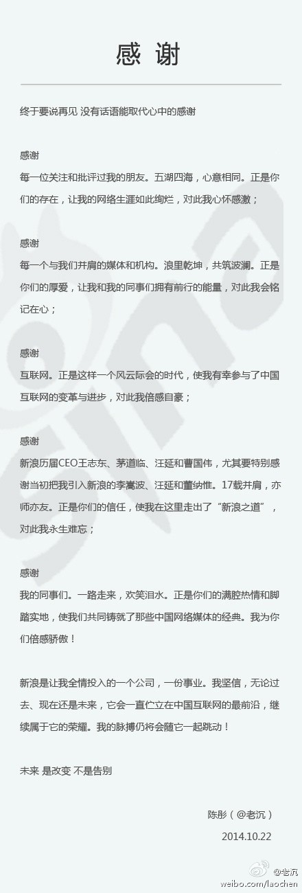 陳彤在微博上寫道:“即將告別新浪。回望17年路程,往事歷歷如昨,心中千言萬語。謹(jǐn)以此信表達(dá)我此刻的心情,感謝大家!”