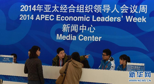 11月4日,國家會議中心新聞中心綜合服務(wù)臺的工作人員在提供咨詢服務(wù)。當(dāng)日,2014年亞太經(jīng)合組織(APEC)領(lǐng)導(dǎo)人會議周兩個新聞中心之一的國家會議中心新聞中心正式啟用向媒體記者開放。據(jù)介紹,新聞中心總面積約11000平方米,全面覆蓋免費無線網(wǎng)絡(luò),將為媒體提供視頻、文字、圖片綜合素材和專業(yè)的廣播電視服務(wù)。新華社記者 陳曄華/攝