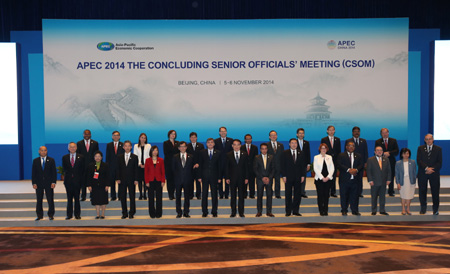11月5日,2014年亞太經(jīng)合組織(APEC)最后一次高官會在北京國家會議中心舉行,拉開了今年APEC領(lǐng)導(dǎo)人會議周大幕。這是出席會議的高級官員合影。