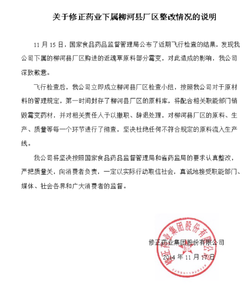 但對于之前國家食藥監(jiān)局提出的修正藥業(yè)存在故意編造虛假檢驗(yàn)報(bào)告行為,已要求吉林省局依法收回其藥品GMP證書的通報(bào),修正藥業(yè)在聲明中并未做出相應(yīng)回復(fù)。
