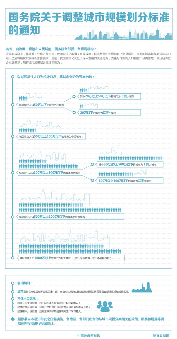國(guó)務(wù)院通知指出,各地區(qū)、各部門(mén)出臺(tái)的與城市規(guī)模分類相關(guān)的政策、標(biāo)準(zhǔn)和規(guī)范等要按照新標(biāo)準(zhǔn)進(jìn)行相應(yīng)修訂。