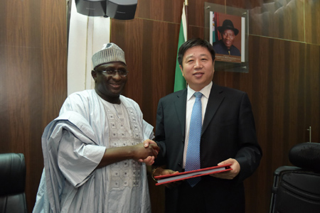 11月19日,中國鐵建中非建設(shè)有限公司在尼日利亞首都阿布賈與尼日利亞交通部正式簽署沿海鐵路項目商務(wù)合同,合同總金額119.7億美元。這是目前中國對外工程承包歷史上單體合同金額最大的項目。 圖為尼日利亞交通部部長奧馬爾(左)與中國鐵建中非建設(shè)有限公司副董事長曹保剛在簽約后握手。