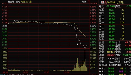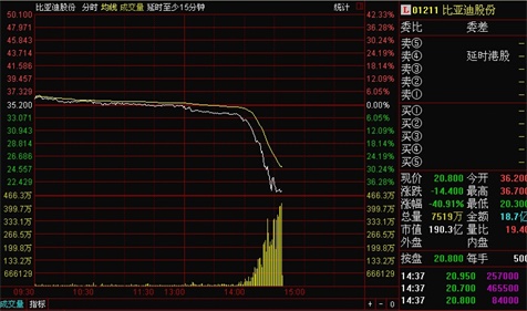 12月18日午后,比亞迪港股突然暴跌40%,并且引發(fā)A股連鎖反應(yīng),盤中一度觸及跌停板。截至14:50,比亞迪A股報(bào)收37.01元,下跌8.57。有市場傳聞系巴菲特?cái)M大舉減持。記者第一時(shí)間致電公司,比亞迪方面回應(yīng),公司現(xiàn)在一切正常,沒有任何突發(fā)事件,對巴菲特減持傳聞并不知曉。