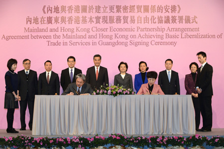 12月18日,《關于內(nèi)地在廣東與香港基本實現(xiàn)服務貿(mào)易自由化的協(xié)議》在港簽署,《協(xié)議》即日生效并在2015年3月1日實施。商務部表示,《協(xié)議》簽署后,內(nèi)地將在廣東率先與香港基本實現(xiàn)服務貿(mào)易自由化,同時為內(nèi)地全境與香港基本實現(xiàn)服務貿(mào)易自由化先行先試積累經(jīng)驗。此間特區(qū)政府及工商界人士認為,《協(xié)議》為內(nèi)地對香港開放市場帶來突破性的發(fā)展,有利于進一步推進兩地經(jīng)濟融合。