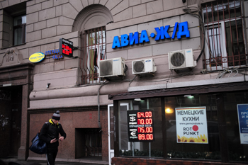 12月16日,在俄羅斯首都莫斯科,行人走過街邊的外幣兌換點! 記者