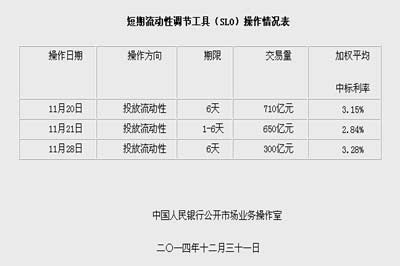 央行今日公告,2014年11月份,人民銀行以利率招標(biāo)方式開展了短期流動(dòng)性調(diào)節(jié)工具(SLO)操作。具體情況如下: