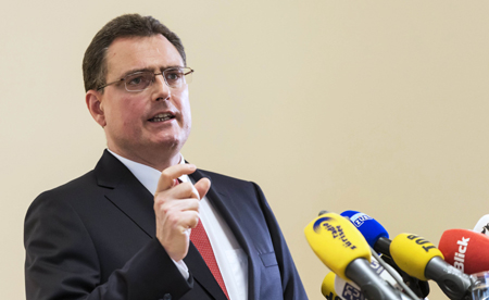 瑞士國家銀行(央行)15日意外宣布取消瑞士法郎對歐元匯率1.20比1的上限,并停止相關購匯行為。在該舉措公布后,瑞郎全線大漲,瑞郎對歐元匯率一度觸及0.8517比1。 圖為瑞士央行行長托馬斯·約爾丹在瑞士蘇黎世的新聞發(fā)布會上發(fā)表講話。